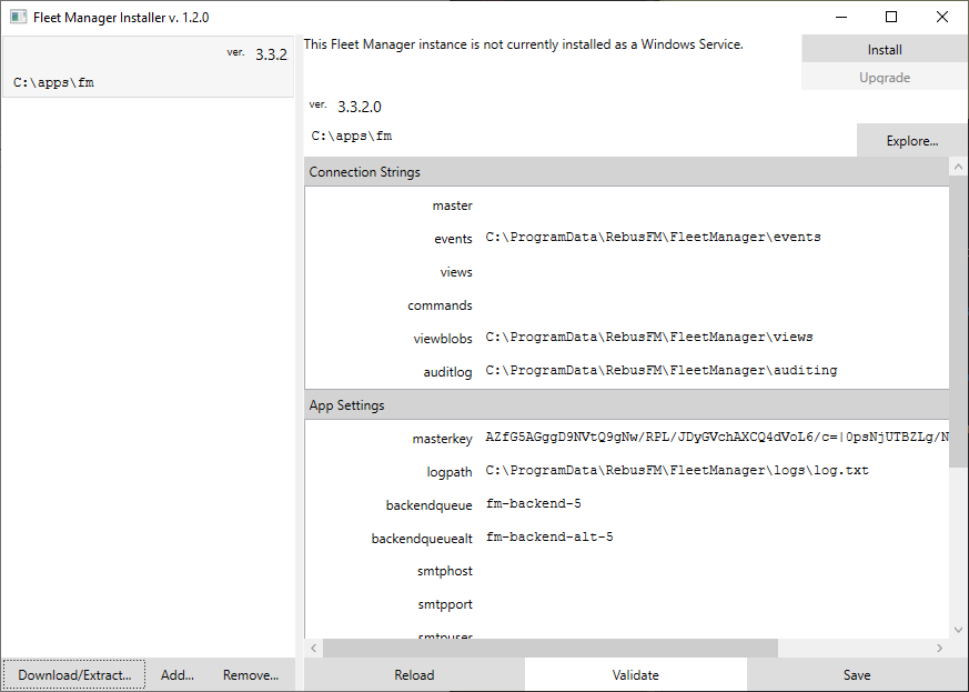 When that has been done, the folder C:\apps\fm will be registered in the installer as a Fleet Manager instance. It should look somewhat like this: