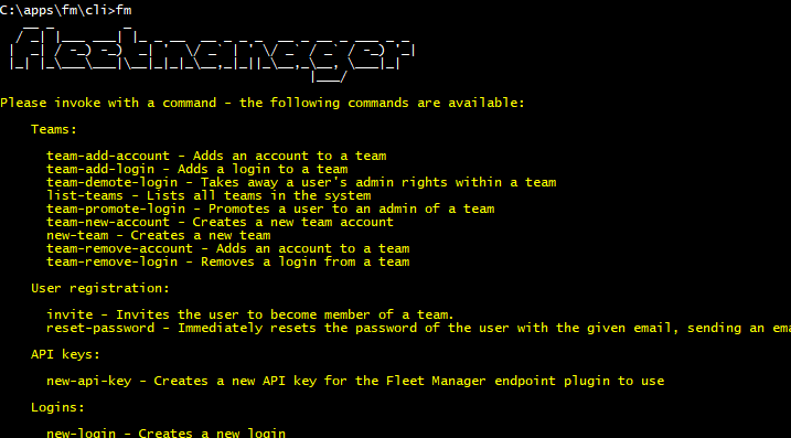 To invite someone (maybe yourself?) in as a team administrator, you need to fire up a Command Prompt and go to the cli directory beneath your Fleet Manager installation – in my case it was C:\apps\fm\cli: