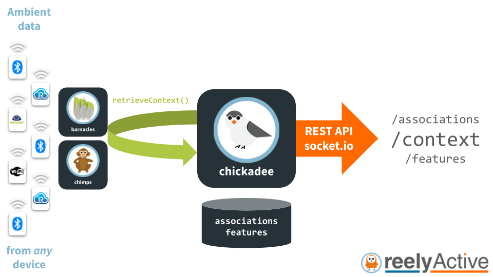 Specifically, chickadee associates wireless device identifiers with metadata such as a URL, a tag, a directory, and/or a position. Additionally, it provides a contextual API when coupled with live data from a barnacles instance and optional chimps instance. And finally, it provides an API to store and retrieve GeoJSON features. chickadee can run standalone, although it is usually run together with its peer modules.