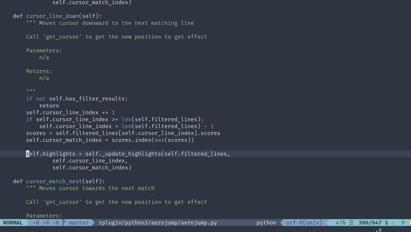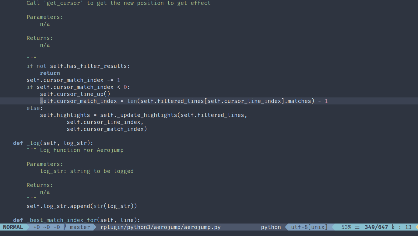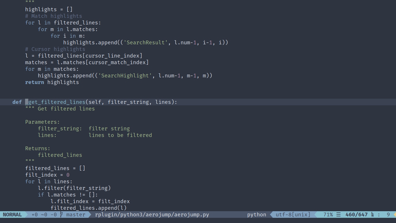 Aerojump is a fuzzy-match searcher/jumper for Neovim. Its goal is to enable fast navigation through searching using the keyboard. It features several modes which can be used depending on your needs. By using an intelligent scoring system it will move the cursor to the best match based on your input.