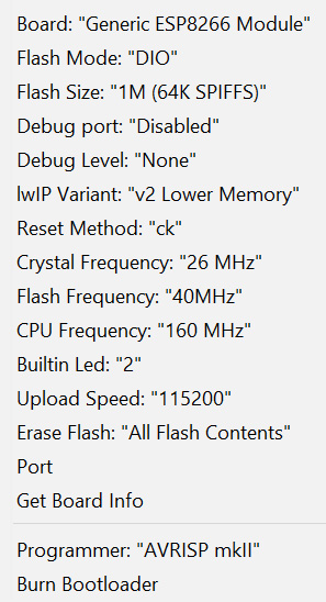 In the Arduino IDE, select Generic ESP8266 Module under Tools > Board. I have used the following settings (running at 160 MHz is probably not necessary):