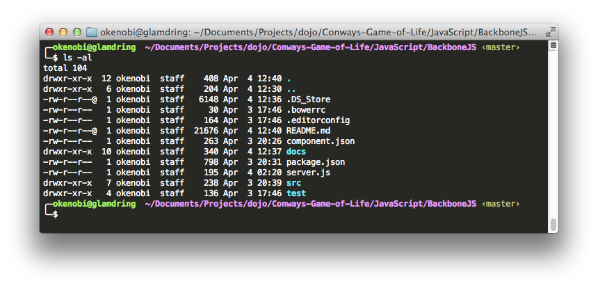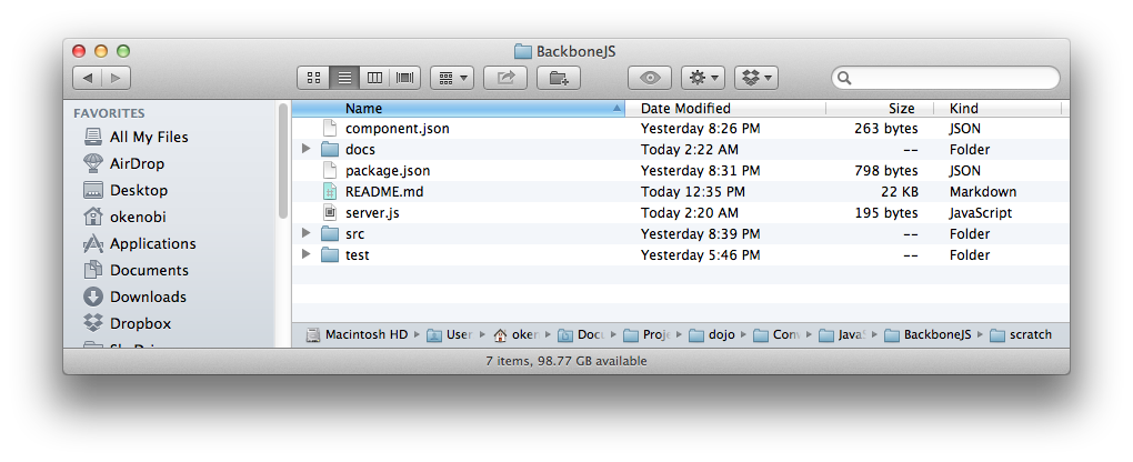 Once you have the repository cloned in your computer, you should browse to this folder (dojo/Conways-Game-of-Life/JavaScript/BackboneJS). It should look like this (plus some hidden files):