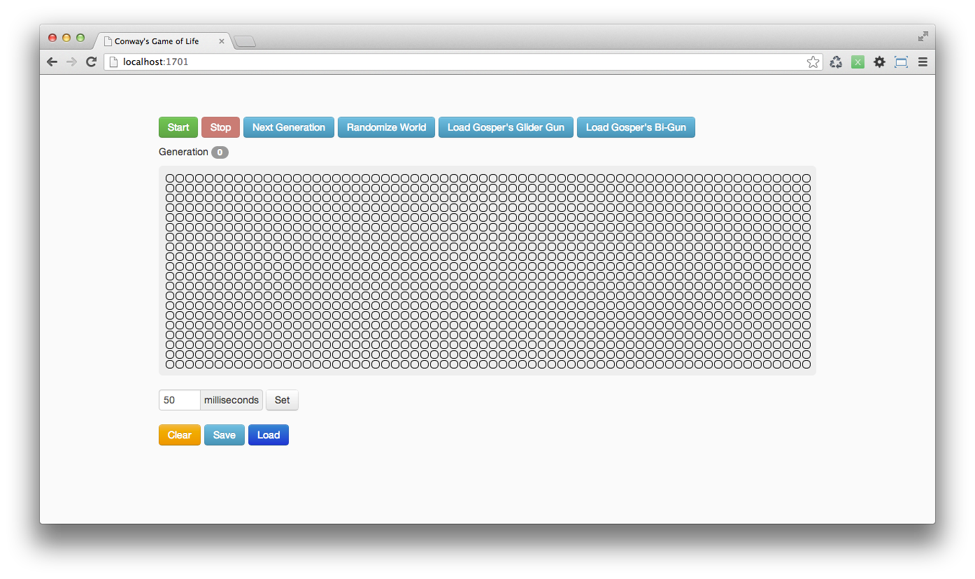 The Generations Counter and the Controls view are the most simplest things possible. They are just standard Backbone.View objects. In the case of the generations counter, it's listening to the "tick" event to update the counter it's keeping track of. It can receive a clear message to reset the counter to zero.