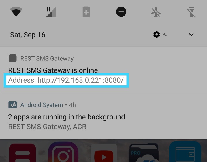 Programmatically send SMS'es with Android Install REST SMS Gateway Add phone's address to a .env file in the root of your project. Example .env file: PHONE_ADDRESS=http://192.168.0.221:8080 Add your app's logic to index.js. Run npm start.