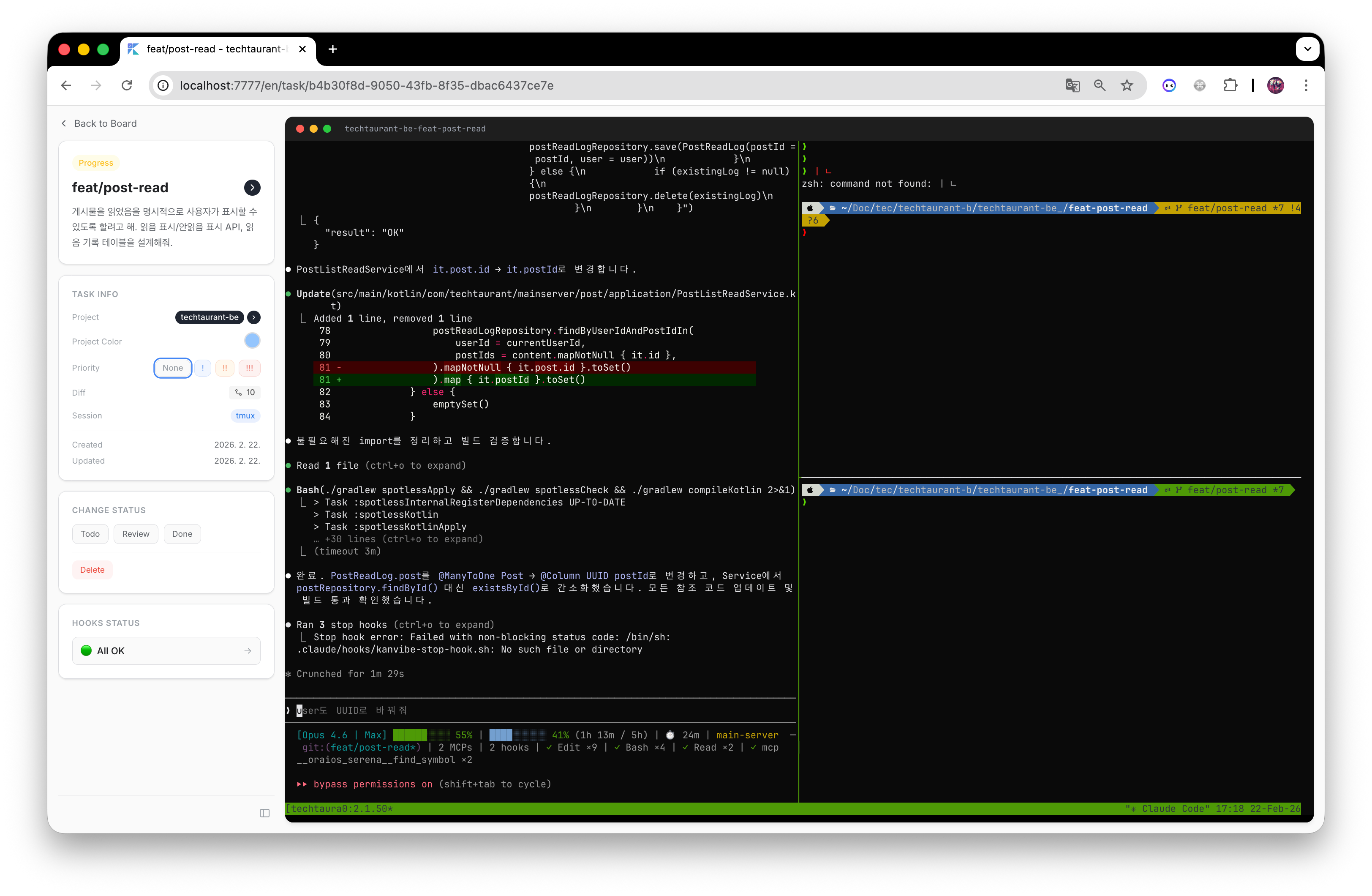 KanVibe 0.0.1 delivers a complete AI-agent-first development workflow in one place: create branch tasks, run real terminal sessions in-browser, and track progress automatically through agent events without manual status updates.
