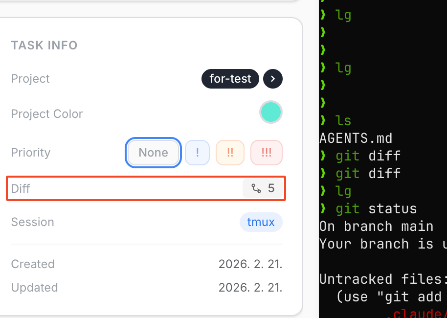 - Open diff view via the Diff badge on task detail