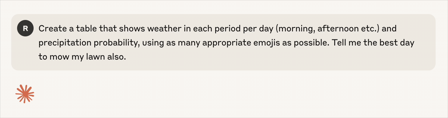 You can combine this MCP server with others to achieve multi-step workflows. For example, once the weather has been checked, you can also tell Claude to add that as an event in your calendar to remind yourself of those plans.