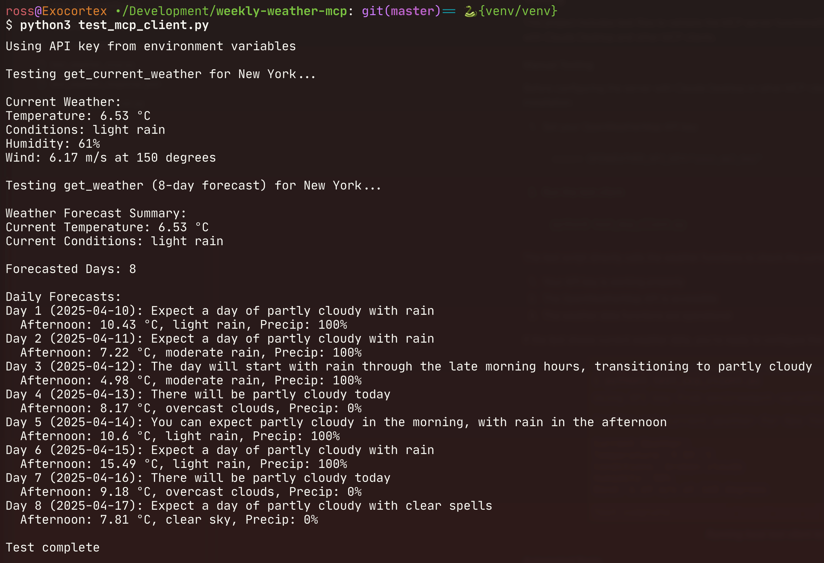 If the test shows current weather data, you’re ready to configure the server with Claude Desktop, Cursor, or other MCP clients!