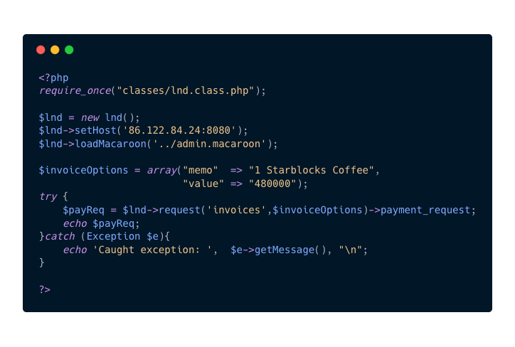 This class provides a basic example for communicating with the Lightning Network Daemon from within PHP. Requests are sent synchronously using cURL. SSL/TLS is optional. The class has no dependencies and should run on all recent versions of PHP.