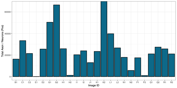 Using images of TH+ DA neurons, we will segment the axons, quantify the total length of neurites, and normalize this on an estimate of the number of cells in the image.