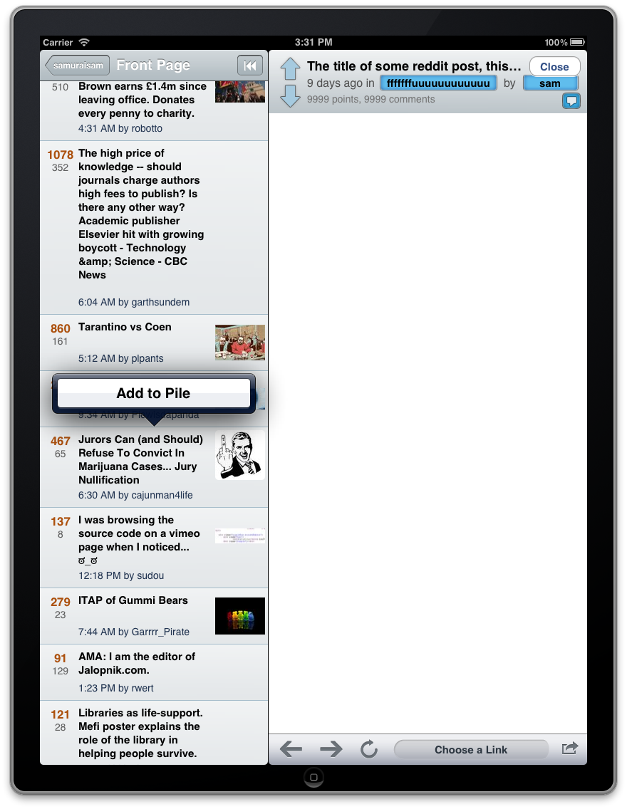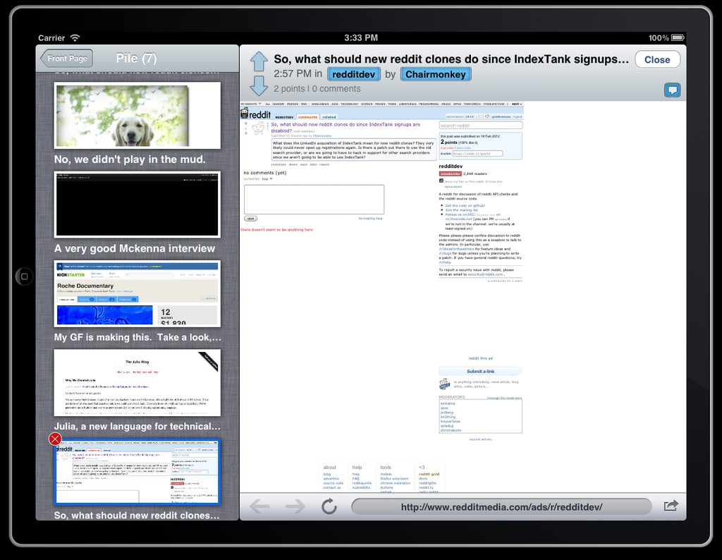- "Pile" which is sort of like opening an interesting link in a background tab. It will save and pre-cache your links in a in the background for later viewing. Swipe over an item in the list to put it in the pile.