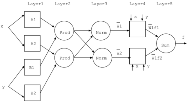 Layer 4: This is the layer where least square is used to get the parameter for the weight. $$ O_{4,1} = \tilde{w}_i f_i = \tilde{w}_i (p_x x + q_i y + r_i) $$