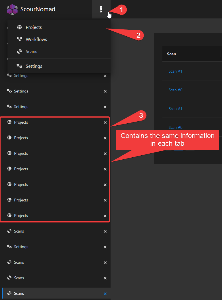 # Steps to reproduce Opening Settings/Projects/Scans will create new tabs for each resulting in duplicates. See image: <img src="https://user-images.githubusercontent.com/33606897/267946015-fd5f0b72-5f7e-42ef-8a58-1bd8f4d3b4a6.png" width="400" height="400"/> Also, clicking on links within the scans will also create a new tab and will not search for an existing open one.