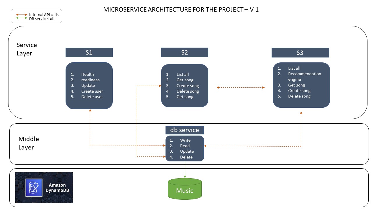 We have decided to implement a songs_list api in addition to the s1 and s2 services. We have made a lot of cross api calls between s3 and s2. Please find the below architecture for our microservices.