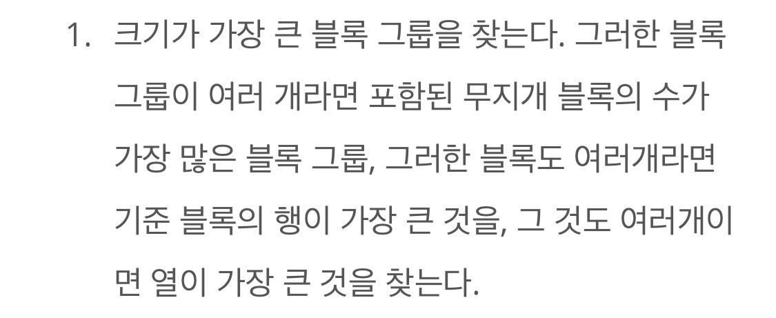 int color = board[i][j]; // 기준색위의 조건에서 걸어주셨다시피, i, j값이 0부터 N-1까지 돌면서 위의 조건을 만족해서 다음 프로세스로 넘어간다면, 무조건 위의 compare 함수에서의 x, y값조건은 항상 충족하게 됩니다. 그래서 compare 함수도 줄일수있을것 같아요. 상어초등학교 문제와 마찬가지로... PQ는 좋은선택은 아닌것으로 생각됩니다! 블록에 포함되는 총 갯수, 무지개색 갯수 이 두가지만 비교해줘도 충분히 해결이 되므로 PQ를 사용안하는쪽으로 해보시는걸 권장해드립니다! 마지막으로, // counter-clock wise