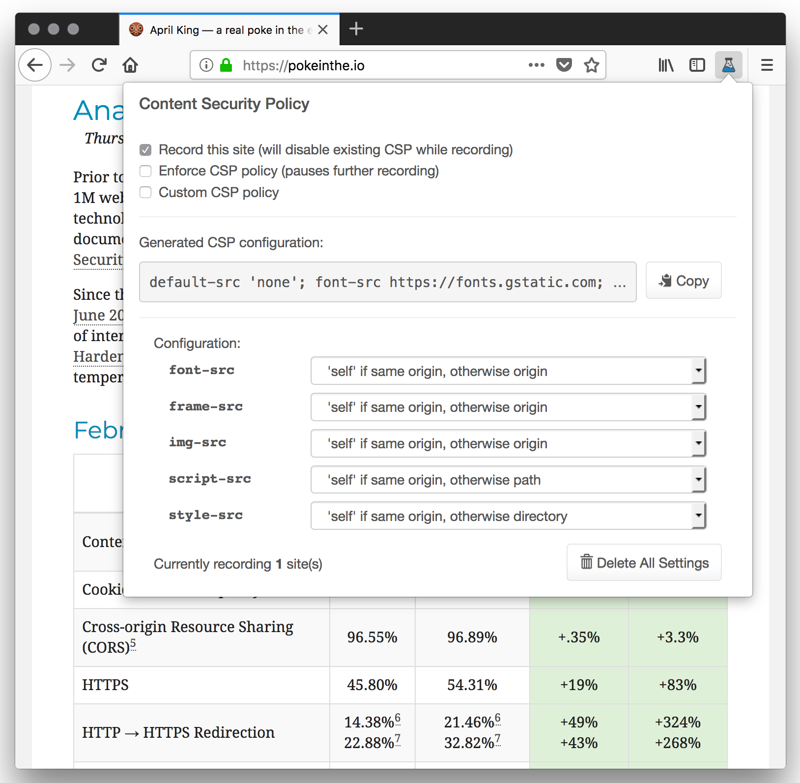Laboratory is a Firefox and Chrome WebExtension that helps you generate a proper Content Security Policy (CSP) header for your website. Simply start recording, browse your site, and enjoy the CSP header that it produces: