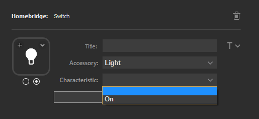 Switch option doesn't seem to have an off? I see on and a blank item. Looking at homebridge logs, when characteristic is set to on the light turns on, when set to the blank line, no command is sent to homebridge.