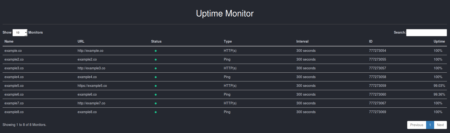 This is a simple one page application to monior uptime. It is powered by the Uptime Robot API. Uptime Robot can notify you about downtime. They offer up to 50 Monitors, Checked Every 5 Minutes, Totally Free.