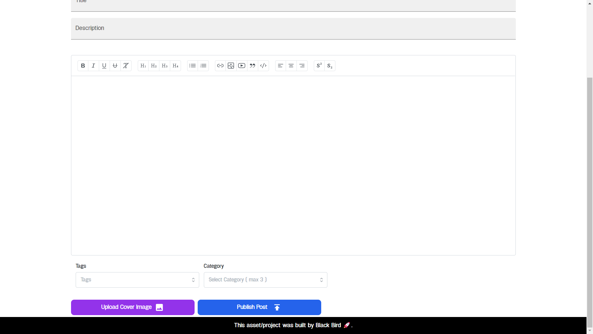 - Rich text editor support, with Image upload to Cloud