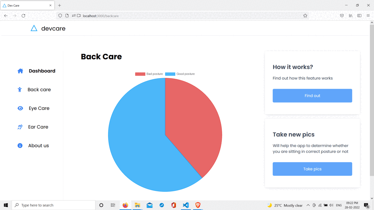 Dev Care will perform an analysis of your habits and visualize them through different charts. For back care, a pie chart is used to visualize how many times you are found sitting in good and bad posture. For eye care, a line chart is used to depict how many times a day you follow the exercise. For ear care, a bar graph is used to depict the daily usage of earphones.