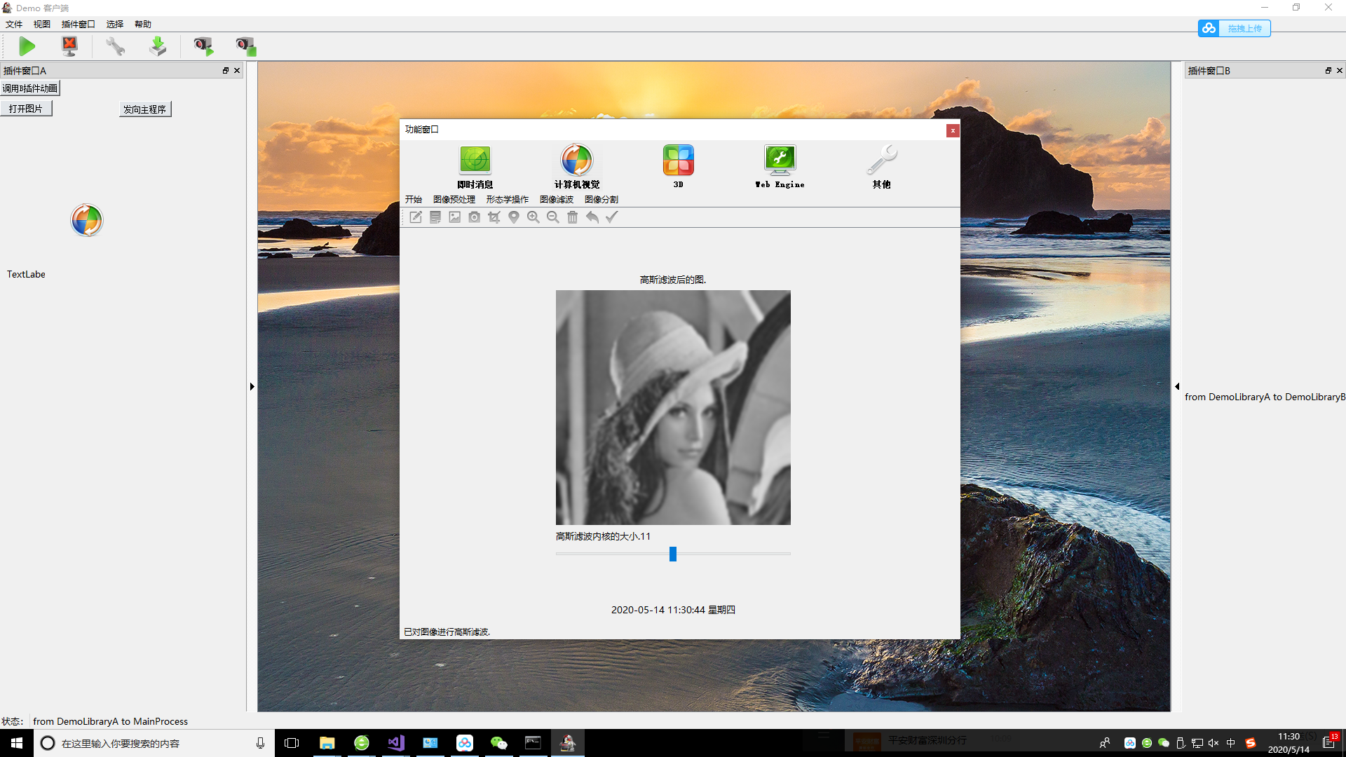 在windows平台基于VS2017嵌套Qt插件开发的一款桌面应用程序,程序整体架构采用插件框架,各摸块通过插件管理器与主系统进行通讯,主系统主要功能包含xmpp、Mqtt即时通讯,opencv视觉处理,vtk3D点云显示,WebEngine展示WebGL或三维页面,线性动画等