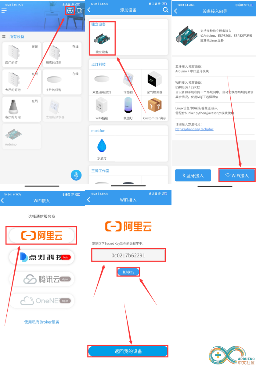 进入App,点击右上角的“+”号,然后选择添加设备,点击选择Arduino -> WiFi接入-> 选择要接入的服务商 -> 复制申请到的Secret Key