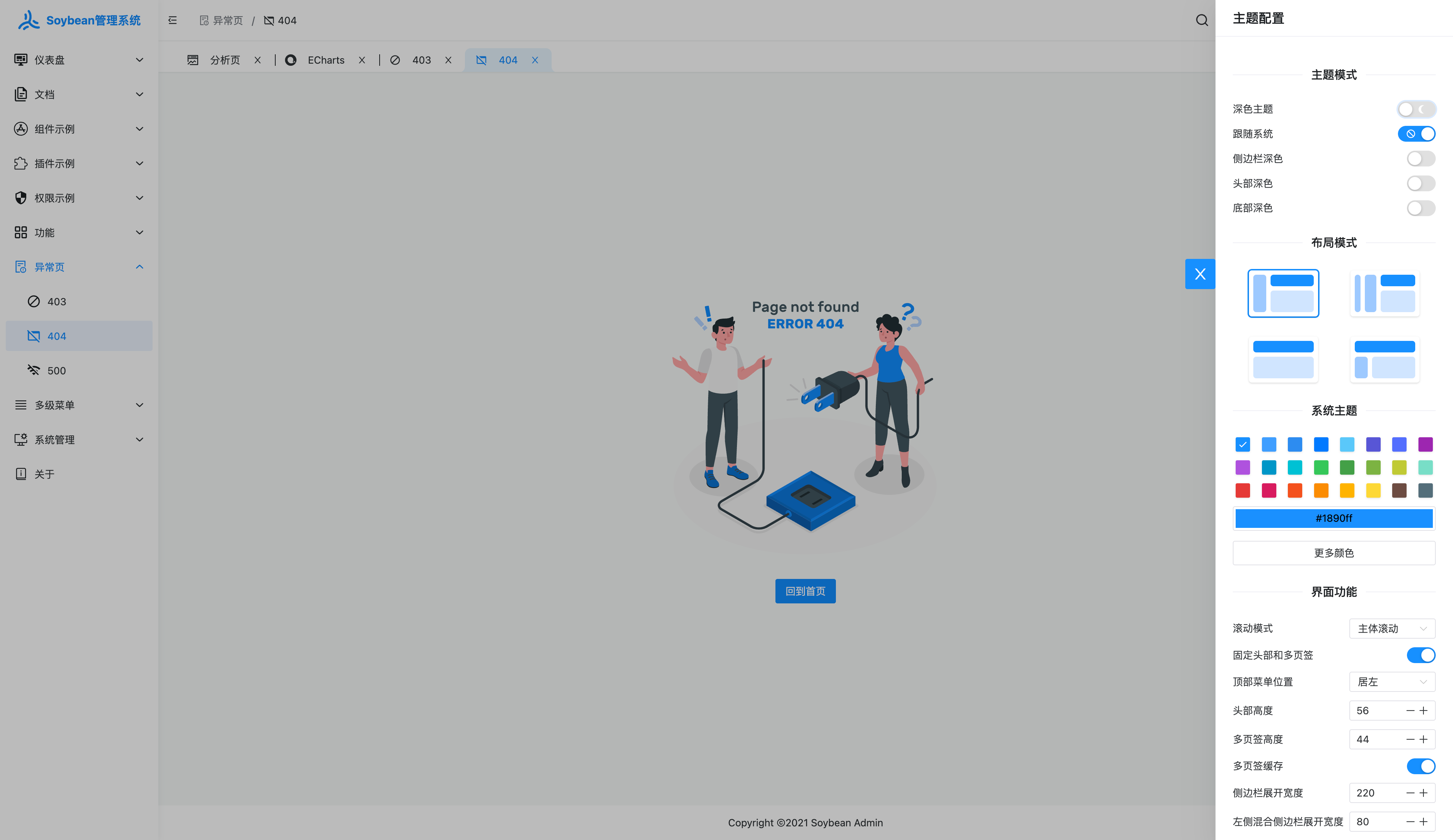 - Rich page components: built-in a variety of pages and components, including 403, 404, 500 pages, as well as layout components, tag components, theme configuration components, etc.