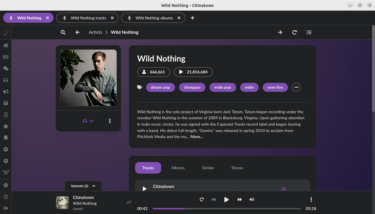 muffon is a cross-platform music streaming client for desktop, which helps you listen to, discover and organize music in an advanced way.