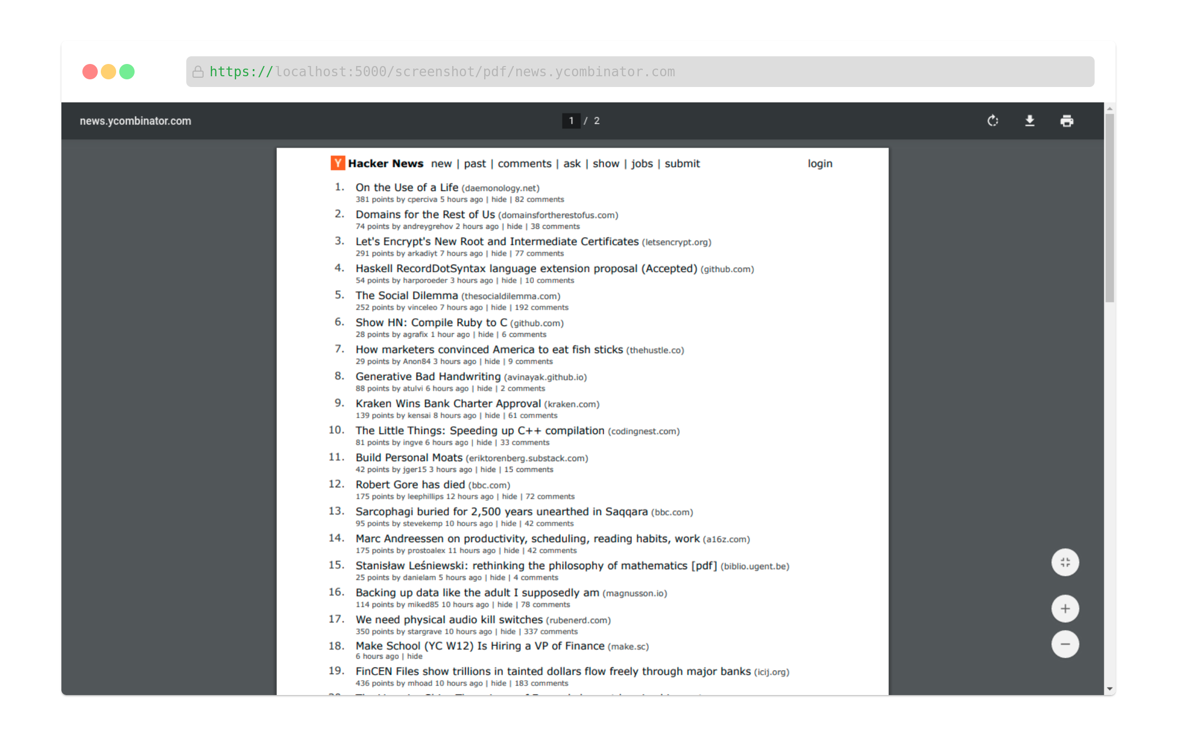 - Visit http://localhost:5000/screenshot/pdf/news.ycombinator.com for PDF.