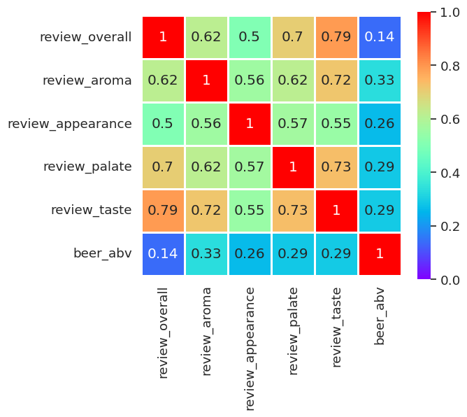 beer_id beer_name beer_style beer_abv rewery_id rewery_name review_overall +/- review_others +/- No. reviews 63649 Rare D.O.S. American Double/Imperial Stout NaN 22147 Peg's Cantina & Brewpub/Cycle Brewing 4.848485 0.091719 4.719697 0.073459 33 44910 Dirty Horse Lambic - Unblended 7.0 15237 De Struise Brouwers 4.820513 0.092892 0.589744 0.081014 39 8626 Southampton Berliner Weisse Berliner Weissbier 2.0 1628 Southampton Publick House 4.768293 0.092306 4.371951 0.100824 41 This is for all beers at 95% confidence. Both the beer style and confidence level can be altered via the dropdown and the slider.