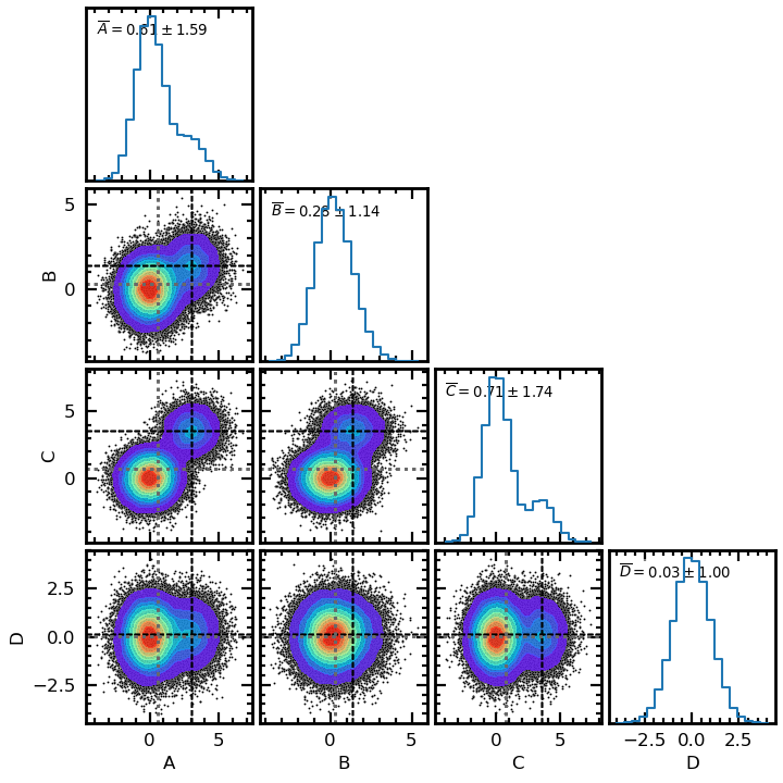 Produces a similar plot to corner, which shows the projections of data in a multi-dimensional space. This uses seaborn to produce a more adjustable, 'publication ready' plot e.g. through variable axis thickness, the use of colour maps, line styles, choice of contours/density maps and order of plotting in relation to scatter plot. Also included is an option to save a hard copy in the required format.
