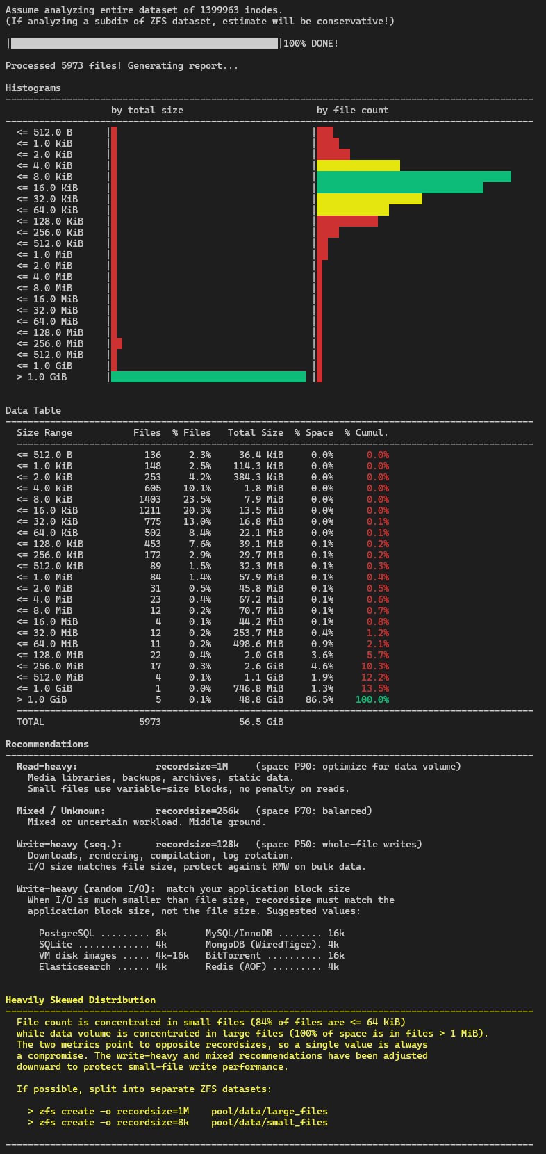 A shell script for Linux that analyzes file size distribution on a directory and recommends ZFS recordsize settings for different workload types.