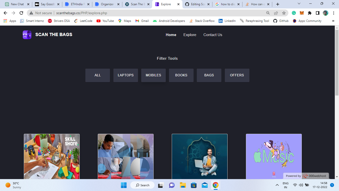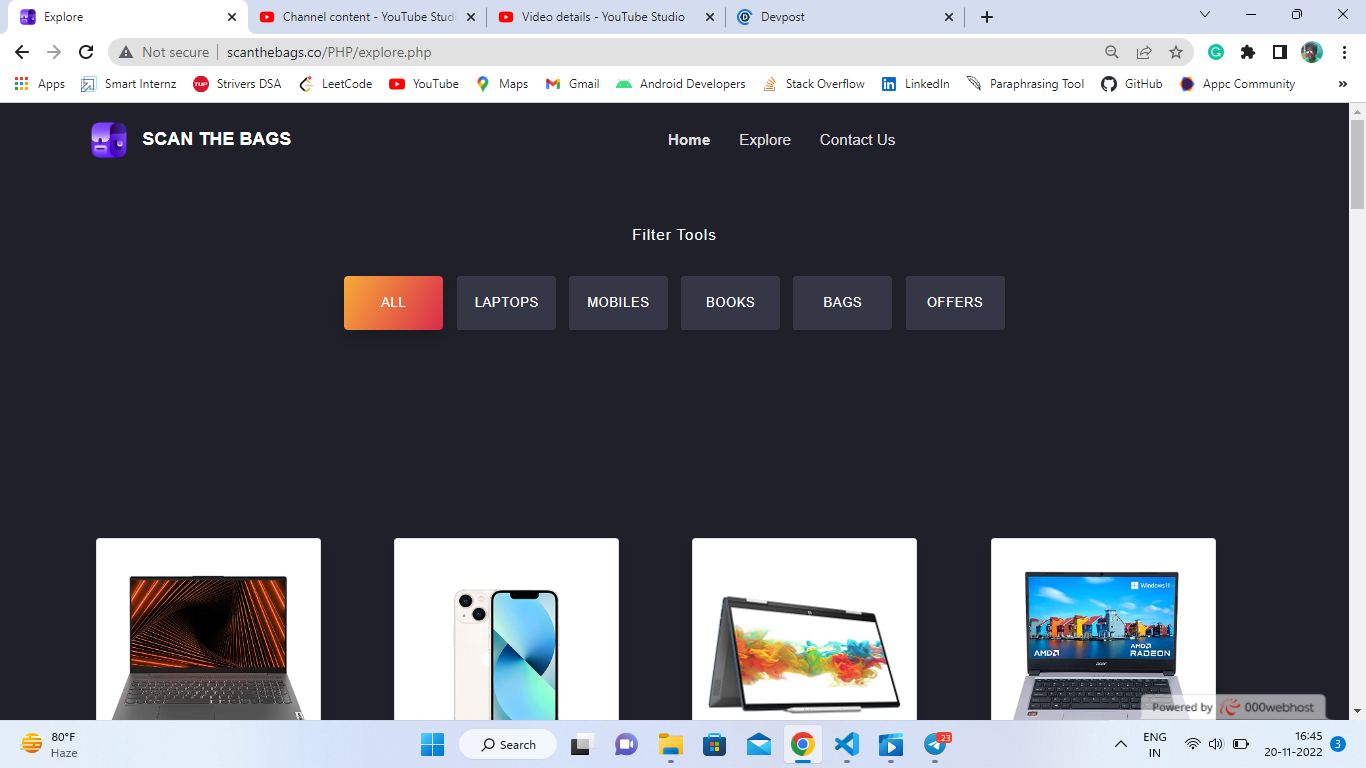 Scan the Bags is a web application designed to help college students find the best products and deals for their needs. The app features a range of products, including smartphones, laptops, backpacks, and more, all carefully selected with students in mind. Users can browse through the available options and see exciting student offers. The app is built using PHP, MySQL, HTML, CSS, and JavaScript.