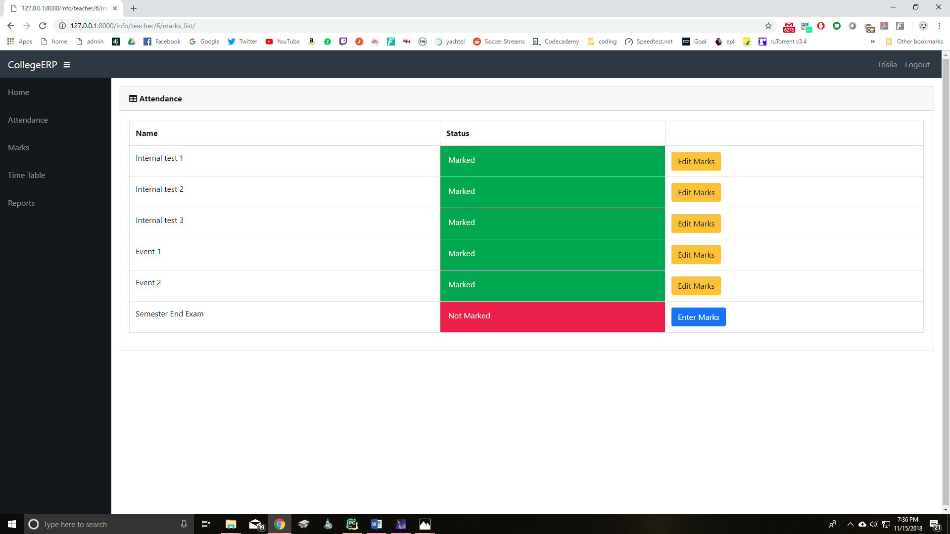A college management system built using Django framework. It is designed for interactions between students and teachers. Features include attendance, marks and time table.