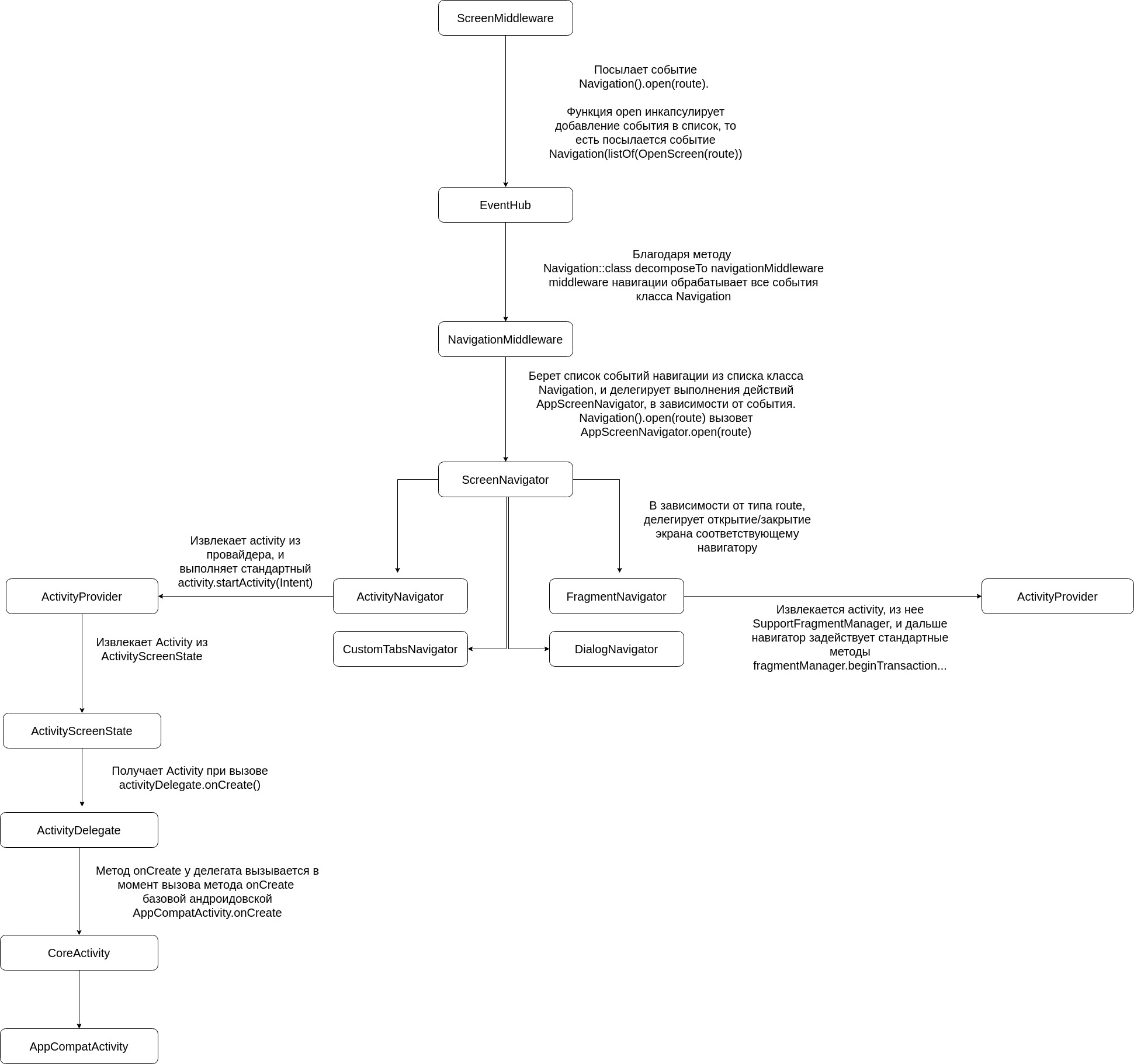 и решает в зависимости от переданного Route (ActivityRoute, FragmentRoute, DialogRoute, итд), какой навигатор использовать, и какой экран тот откроет.