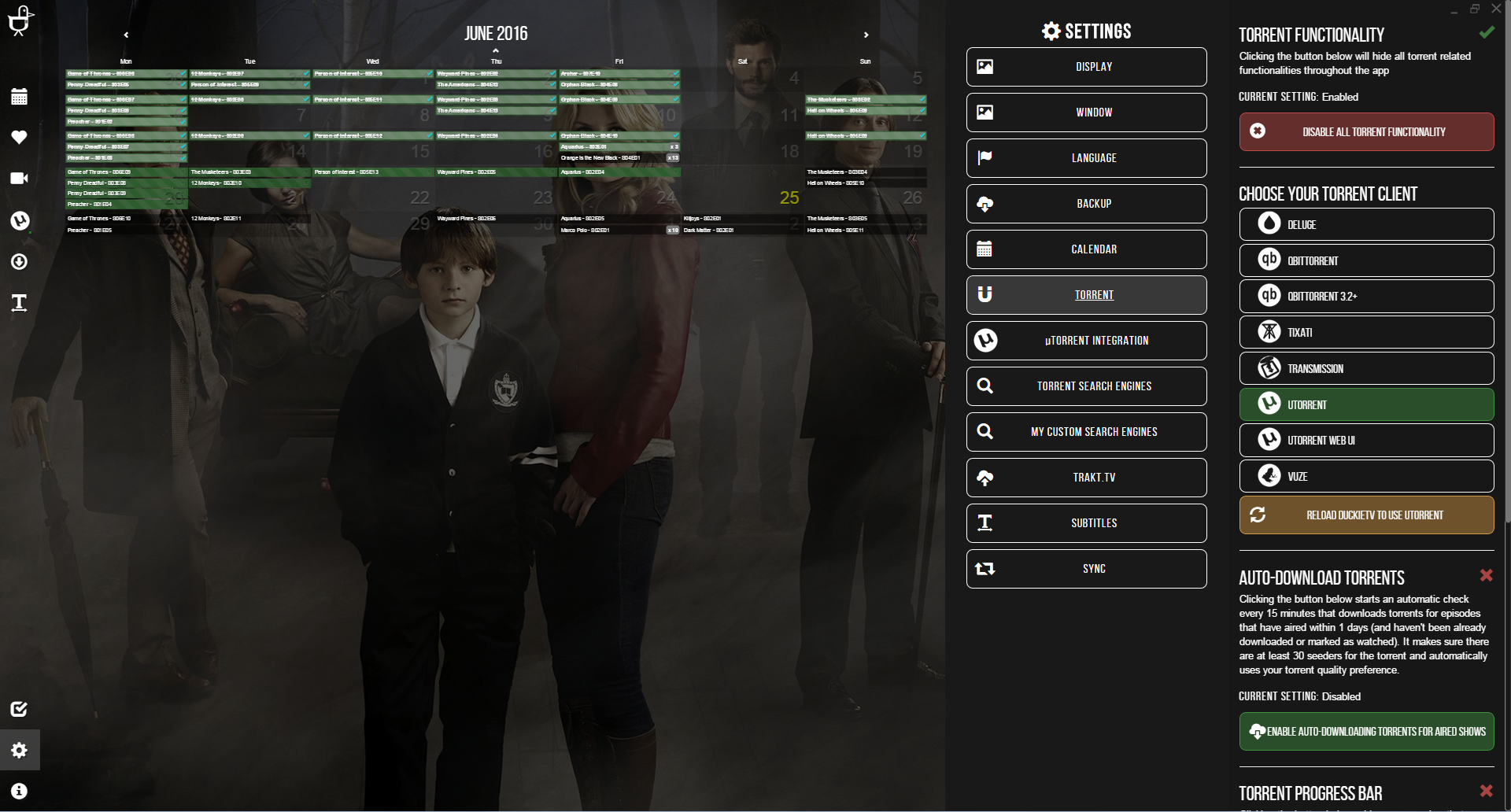 With the integrated DuckieTorrent client, users can connect DuckieTV to local Torrent client and be updated on the download progress without switching applications. Support is available for clients of µTorrent/BitTorrent, Aria2, BiglyBT, Deluge, Ktorrent, qBittorrent, rTorrent, Tixati, Transmission, tTorrent and Vuze.