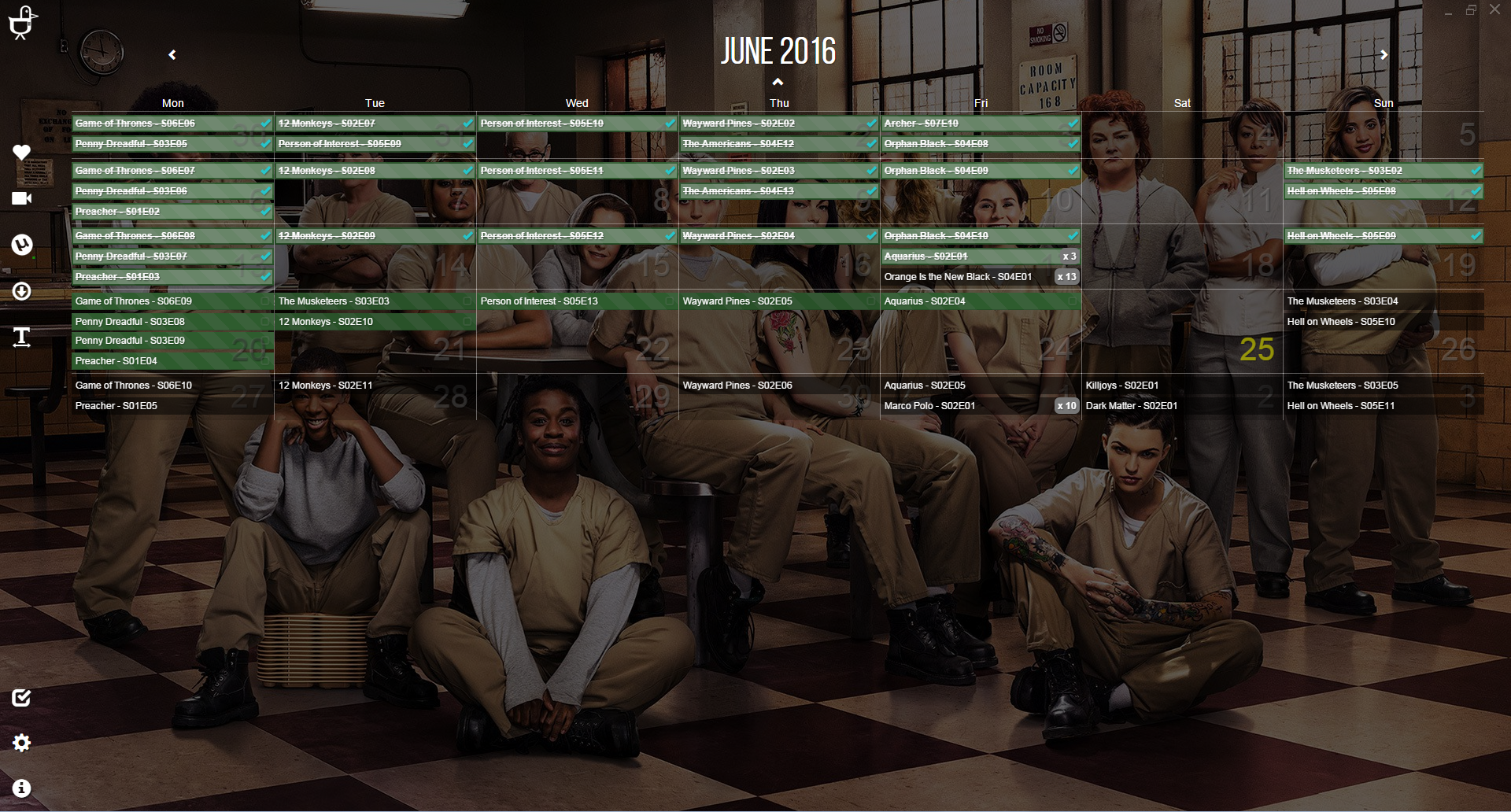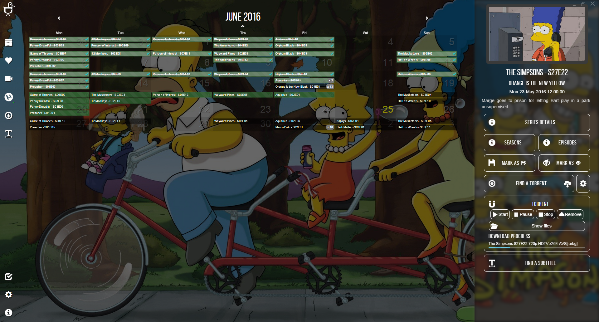 Your main screen is a beautiful calendar with backgrounds tailored to the shows you are watching