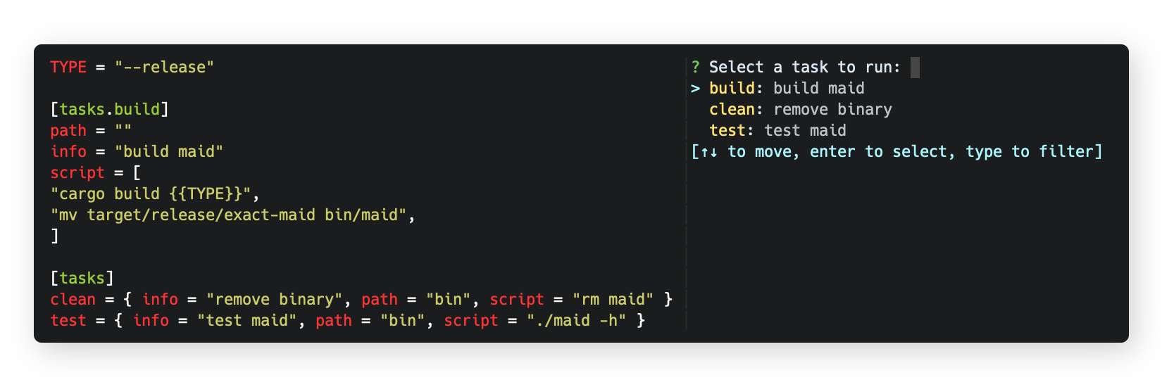 Maid is a task runner / build tool that aims to be simpler and easier to use than, for example, GNU Make. Tasks are stored in a file called maidfile using the TOML syntax.