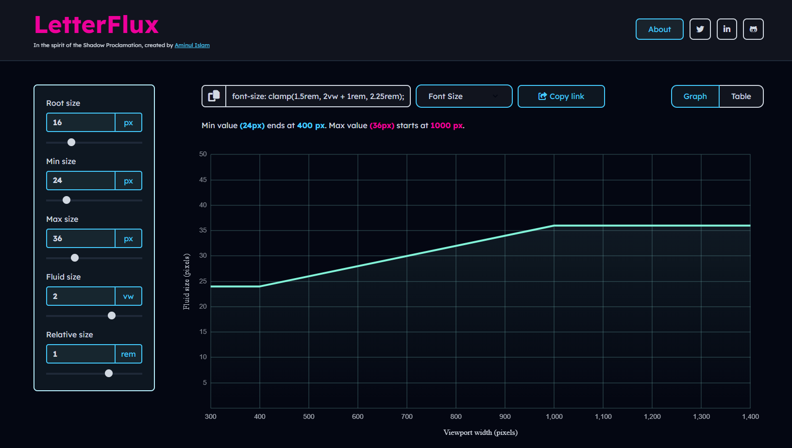- Live Preview: Real-time graph visualization of fluid CSS behavior