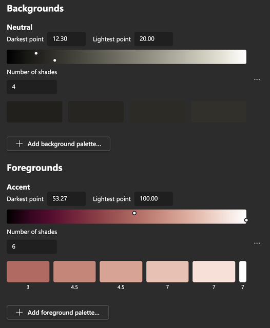 For each palette in a collection there are two controls: one for setting the range of lightness (L) values in the palette to use, and one for setting the number of shades. For foreground shades, the minimum assured WCAG contrast ratio standard that the shade has against all backgrounds in the theme is shown below the shade.