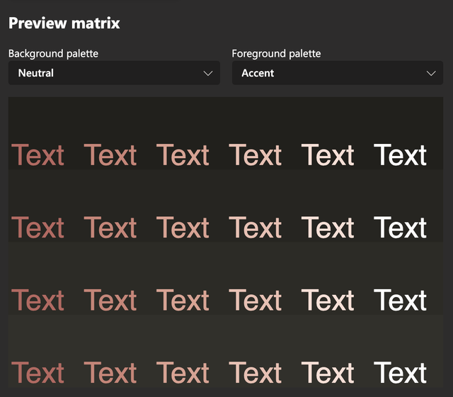 The theme page also inclues a preview of how foreground shades look against background shades.