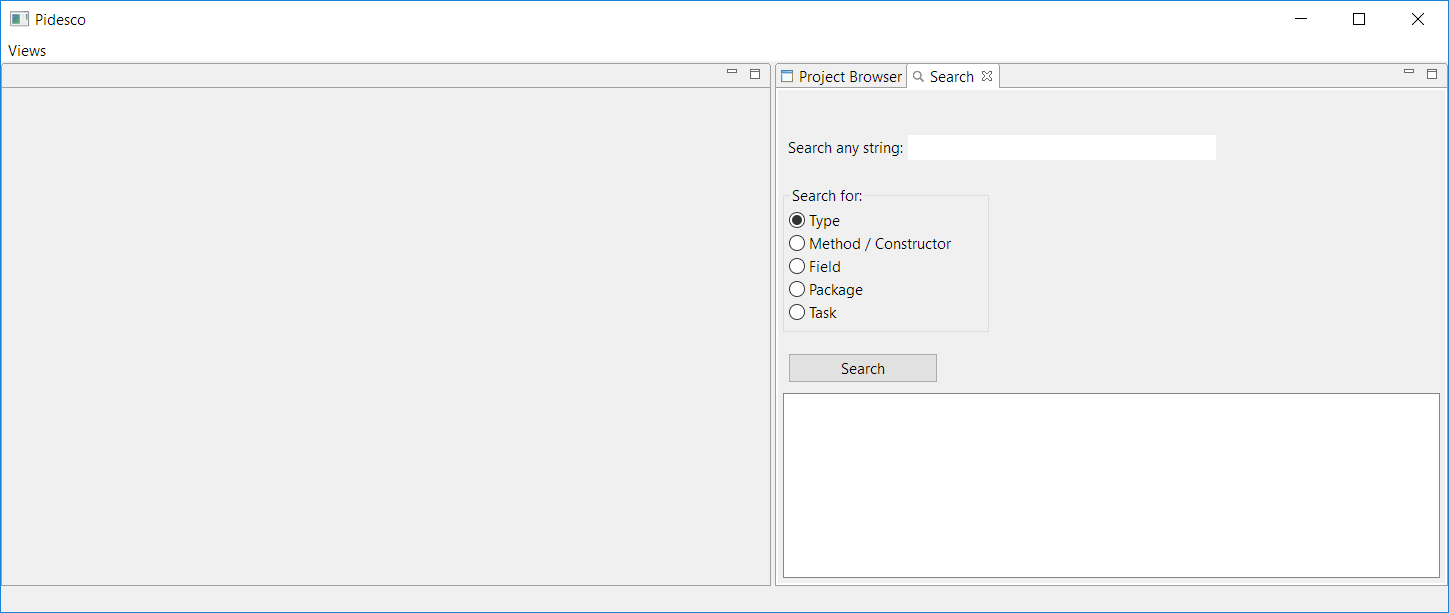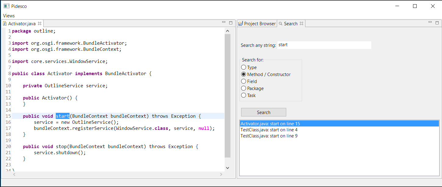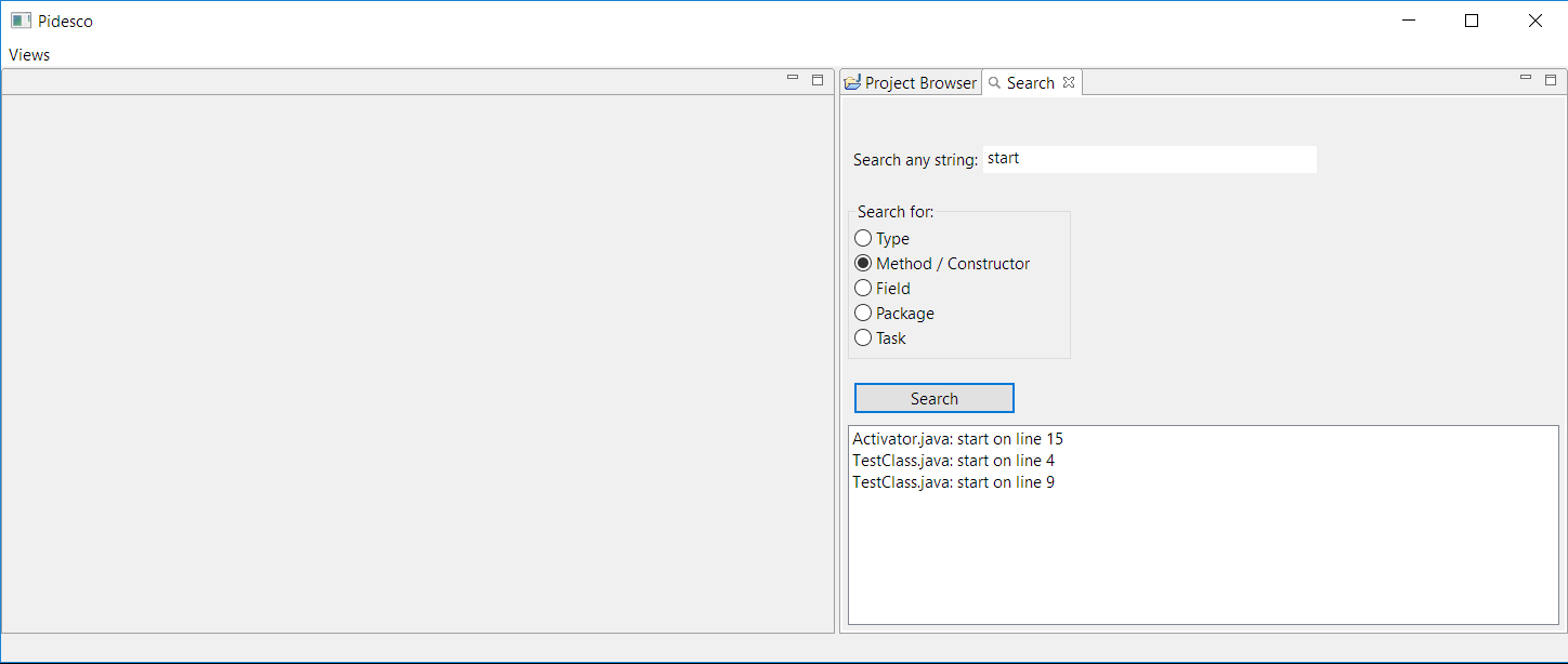 We enter what we want to search in the Search box, select a type of search (type, method / constructor, etc) and hit the search button. The results are displayed in the ListViewer below: