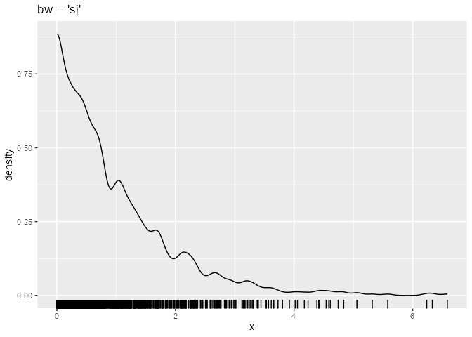 ggtitle("bw = 'sj'")Counter-argument might be that if you have some exponential data, df <- data.frame(x = rexp(1000))