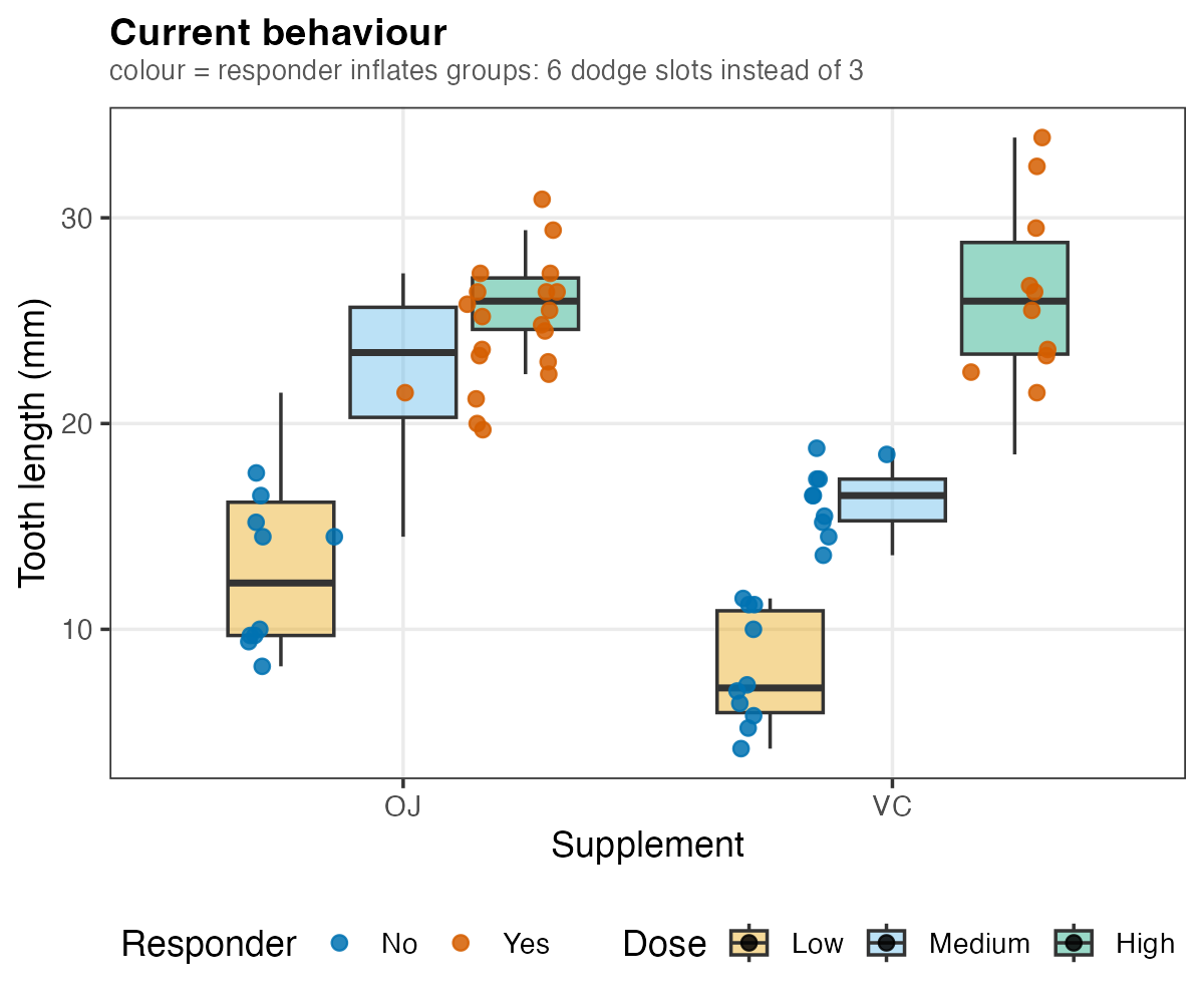 position_jitterdodge()is documented as "primarily used for aligning points generated throughgeom_point()with dodged boxplots (e.g., ageom_boxplot()with a fill aesthetic supplied)." However, the function currently derives dodge grouping from the full implicitgroupinteraction, which includes every discrete aesthetic in the layer — not justfill. Addingcolour,shape, orlinetypesilently breaks the alignment this function is designed to provide.Approach
