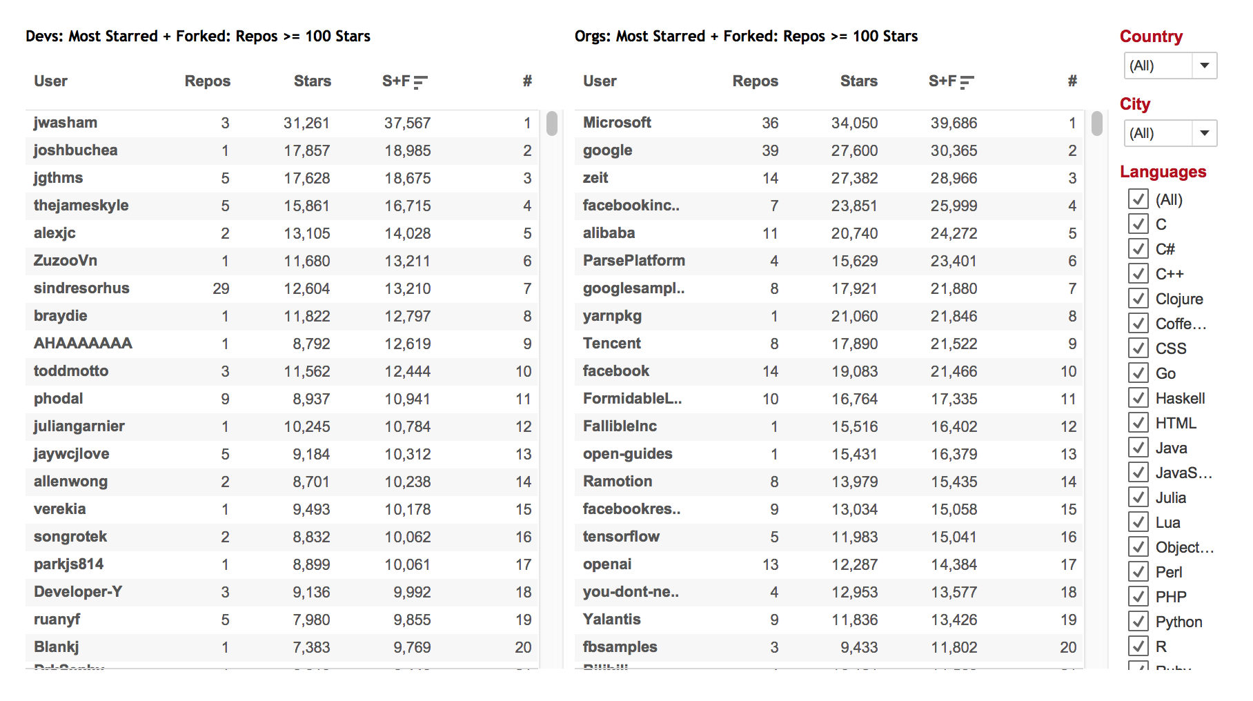 Viz provides stats for repos, users, and orgs by stars (and in many cases, forks). Stars and forks are not perfect metrics, yet they are simple and fairly effective measures of interest. For a more detailed discussion on measuring repo popularity, check out "On the Popularity of GitHub Applications: