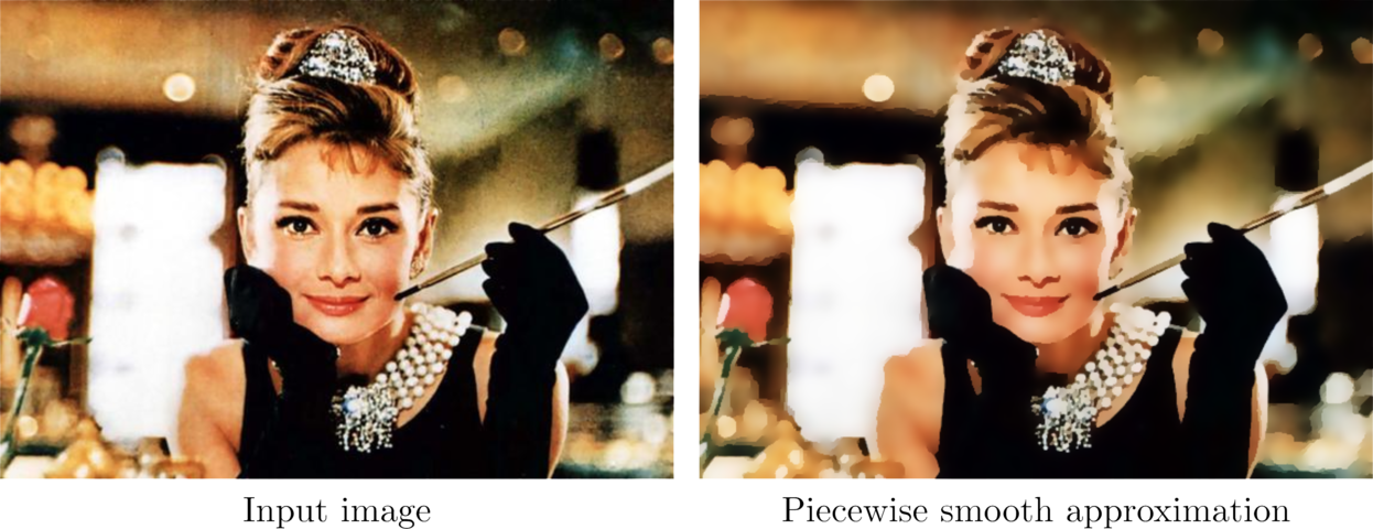 The algorithms computes piecewise smooth and piecewise constant approximations to input images. The result will be smooth over more or less large regions, but is allowed to have sharp color jumps (discontinuities) between regions of smoothness. Applications range from image denoising to producing cartooning image effects. The model describning how exactly the result should look like -- the Mumford-Shah model -- has a long history and is among the most cited in computer vision. Current state-of-the-art approaches either use heuristics introducing additional artificial parameters, which leads to parameter-sensitive results, or require minutes of run time for a single VGA color image, see the above paper for more details.