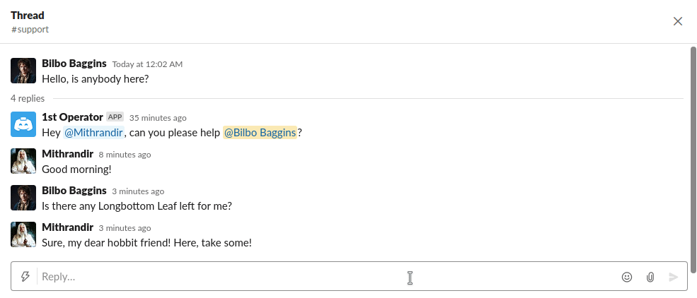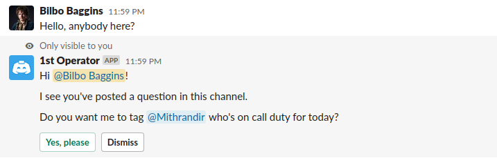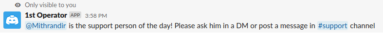 If the bot notices a message in the #support channel's main thread, it will offer the sender to tag the person on call duty for the day. The conversation with this person is opened as a thread to the original message.