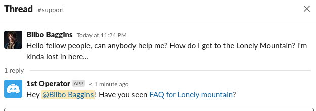 If the bot notices messages in the #support channel's main thread that contains a predefined regexp, it starts a new thread and links FAQ document for each matched regexp.