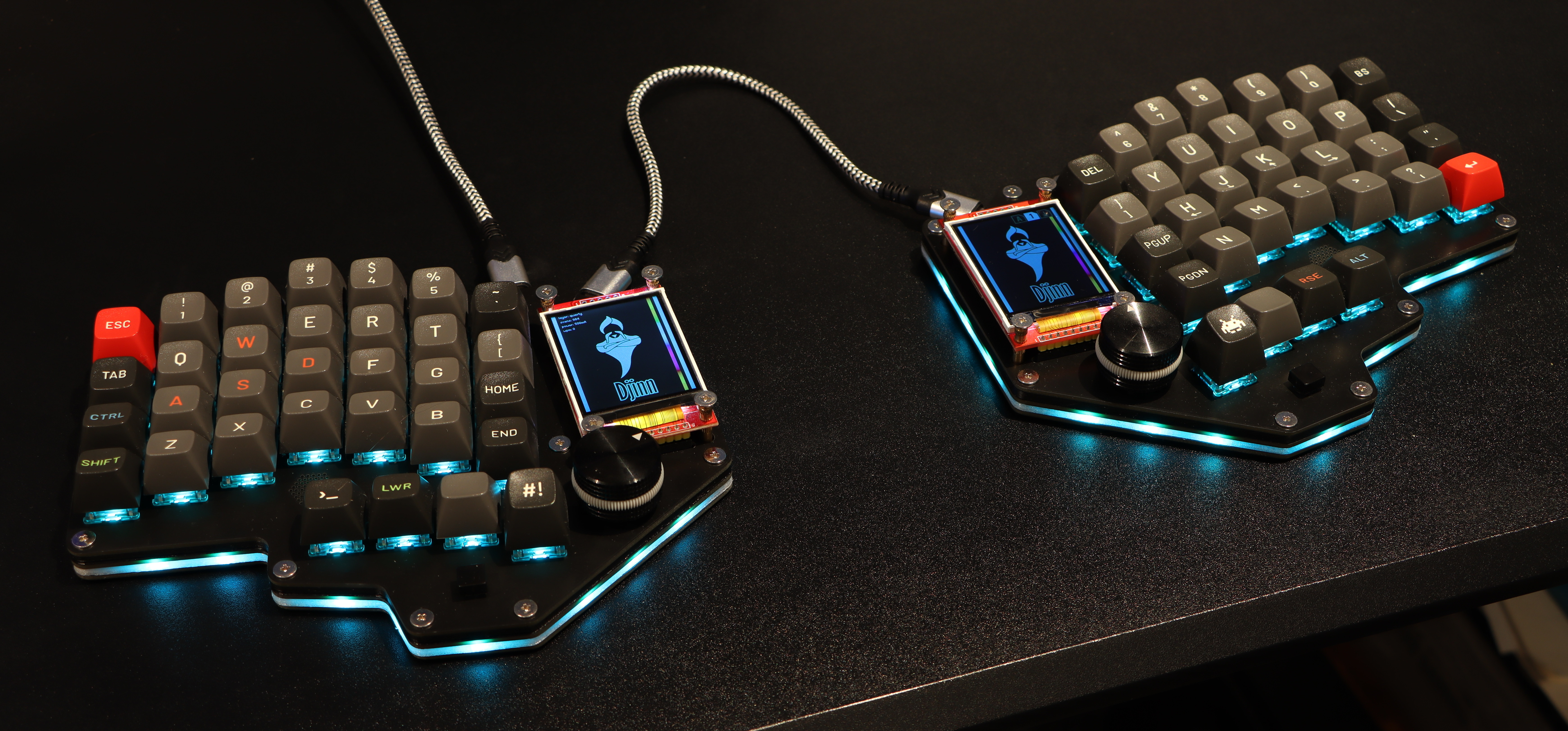 The Djinn is a 64-key split keyboard -- dual 4x7 with a 4-key thumb cluster. It also has a 5-way tactile switch under the thumb.