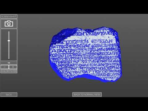 VisualFacts also offers a detailed lighting feature. A light source can be positioned shining down on an artifact from any angle and with adjustable brightness. Since both positioning an artifact and looking at it from different angles are the same interaction in the program, the user can fix the lights position relative to the object, creating easy-towork-with lighting conditions We also implemented two shaders that simplify the reading and analyzing process. The angle shader colors in every part of an artifact that is not parallel to the screen and thus colors in writing efficiently. The plane shader enables the user to raise and lower a plane through the artifact, coloring everything that lies beneath that plane. This way, something similar to a depth-map of the artifact is visualized.